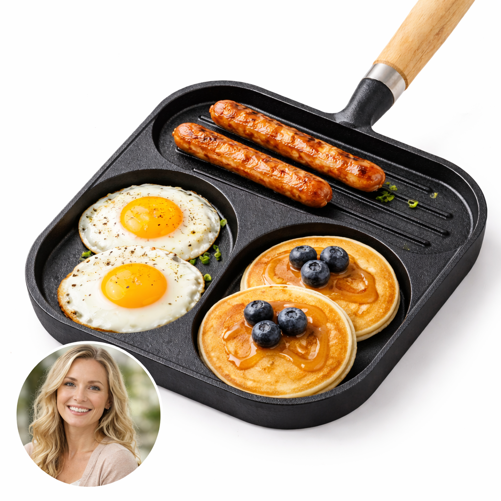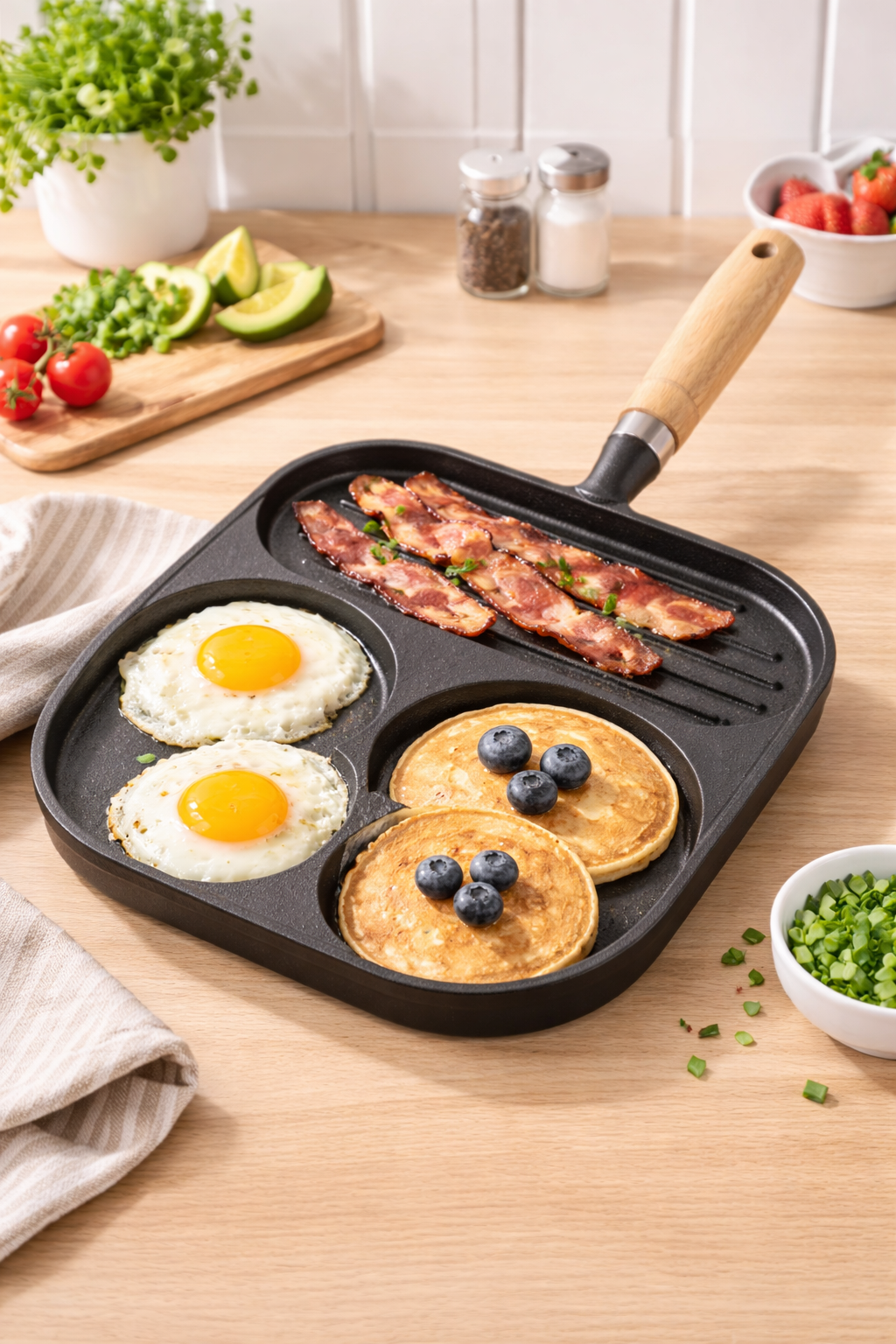 Cook eggs, bacon, and veggies all at once thanks to the Complete Pan's divided sections — no more juggling multiple pans.