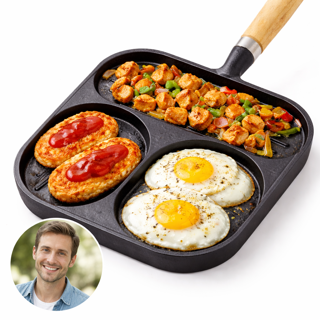It features multiple divided sections so you can cook different foods at the same time on a single pan.